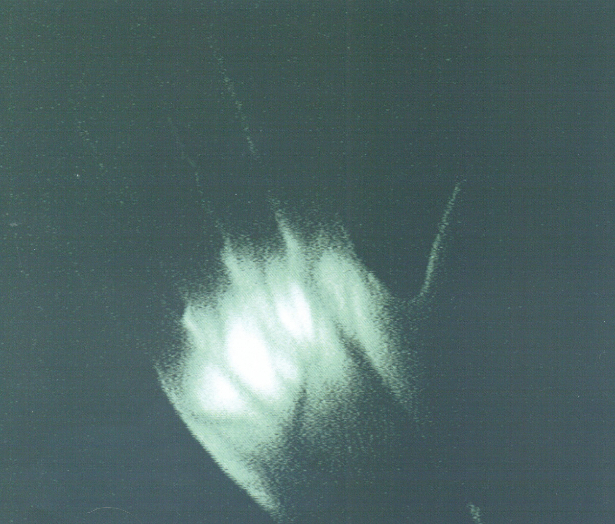Die normale Lichtabstrahlung eines Akupunkturpunktes (ganz oben) verändert sich durch den Stich mit der Akupunkturnadel dramatisch (Mitte): Die Einstichstelle weist eine sehr kleinteilige Abstrahlung auf, während das umliegende Arreal synchron auf gleicher Wellenlänge (ähnlich dem Laserlicht) sendet. Eine Stunde später ist die Abstrahlung wieder normalisiert - bis auf den durch den Stich verletzten Bereich (Bild unten)