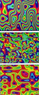Abstrahlung Mit speziellen Lichtmeßgeräten kann man die normale Biophotonen-Abstrahlung messen (gleiche Farben zeigen identische Wellenlängen; gemessene Fläche zirka 2x3 mm): - Gesunde Haut erscheint wie eine leicht gewellte Wasseroberfläche (ganz oben); bei Neurodermitis hingegen sind kleinere, zackig abgegrenzte Zonen erkennbar (Mitte), die sich nach einer Softlaser-Bestrahlung wieder der gesunden Hautabstrahlung annähern (unten)