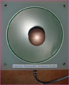 Die Teslaspule transformiert das Eingangsignal in eine longitudinale Welle. Eingangswiderstand 7 – 8 Ohm Durchmesser 130mm in Box inkl. Klinkenkabel 3,5 mm Stecker